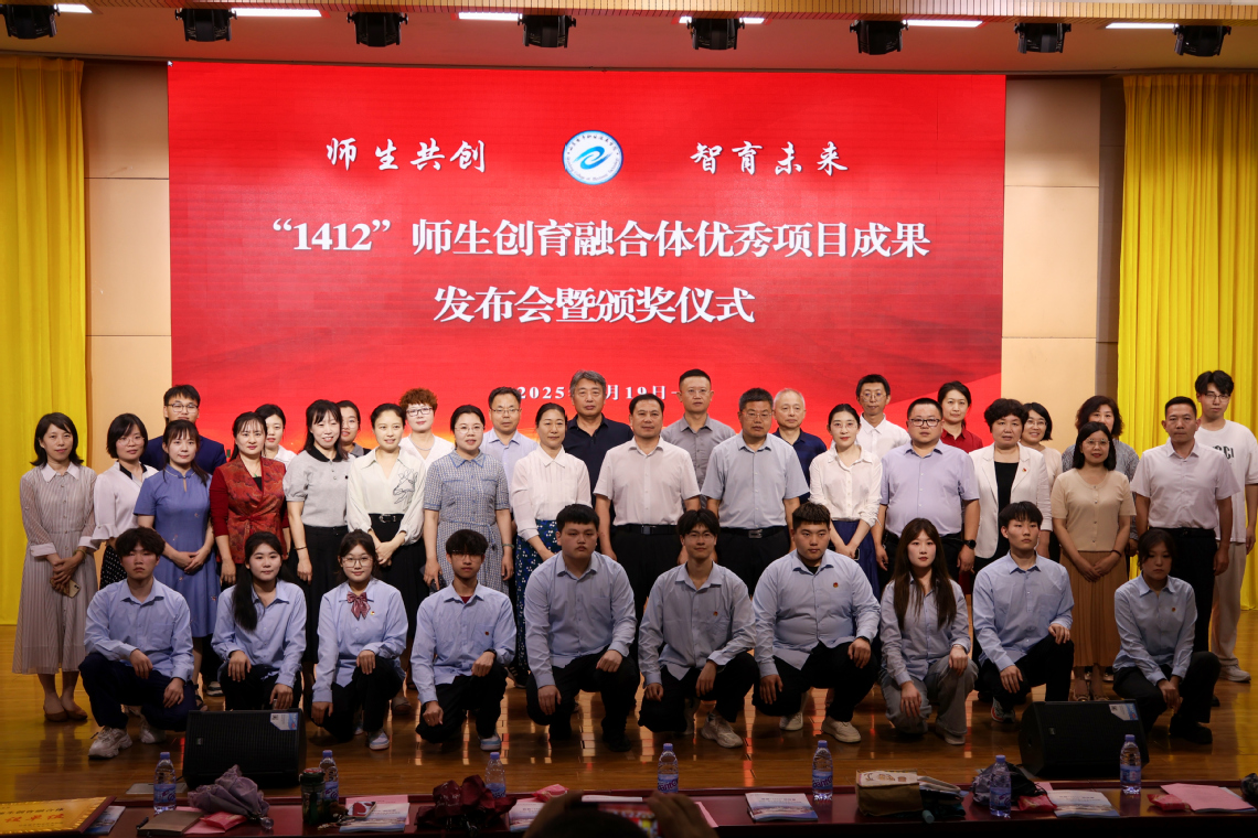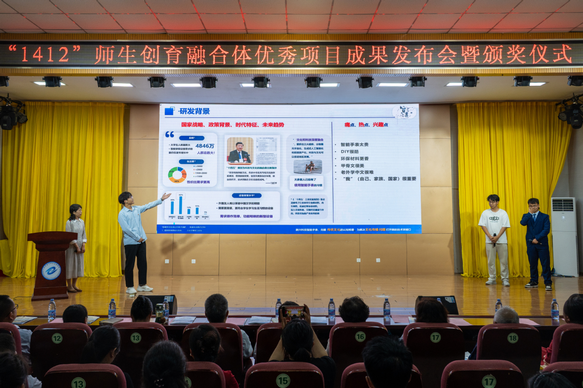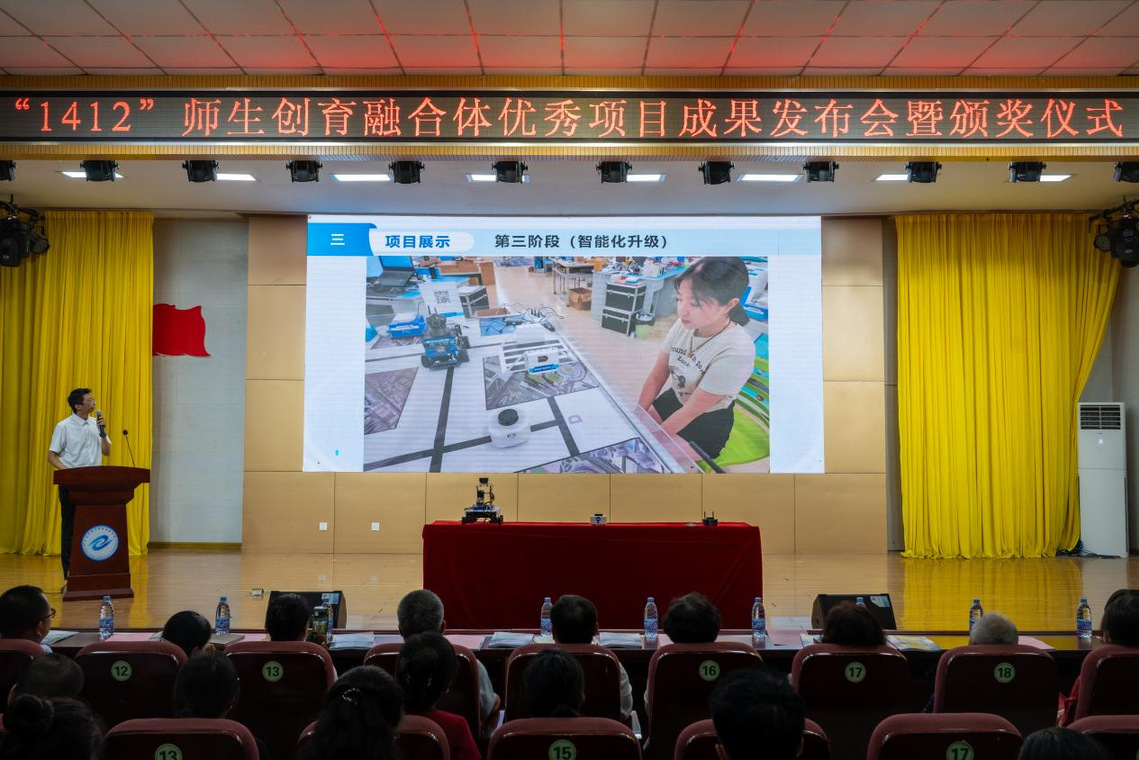 活动在一段回顾师生奋斗历程的快闪视频中拉开帷幕,生动呈现了从实验室深夜攻关到赛场自信绽放的点点滴滴。教务处处长张欣宣读了项目评审情况及表彰决定。首轮颁奖环节,“1412”师生创育融合体“十佳项目作品”团队代表闪亮登台,宣传统战部部长聂莺为他们送上这份殊荣。这些属于探索者与追梦者的荣誉,不仅是技术创新的结晶,更是“师生共创”理念下教学相长、情谊交融的最佳印证。