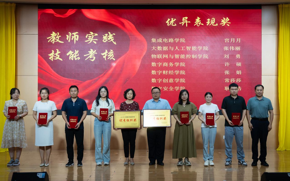 在历时两个月的专业教师实践技能考核工作中,集成电路学院与数字商务学院凭借精细化组织管理与显著改革成效脱颖而出,荣获“优秀组织奖”,集成电路学院院长郭隆健、数字商务学院院长李敏上台分享了本次活动的组织经验与心得体会,为全校“双师型”队伍建设提供了可复制的改革范式。来自各二级学院的7位教师在实操考核中展现出过硬的专业技能,荣获“优异表现奖”。张建臣为表现优异的2个学院及7位优秀教师代表颁奖。