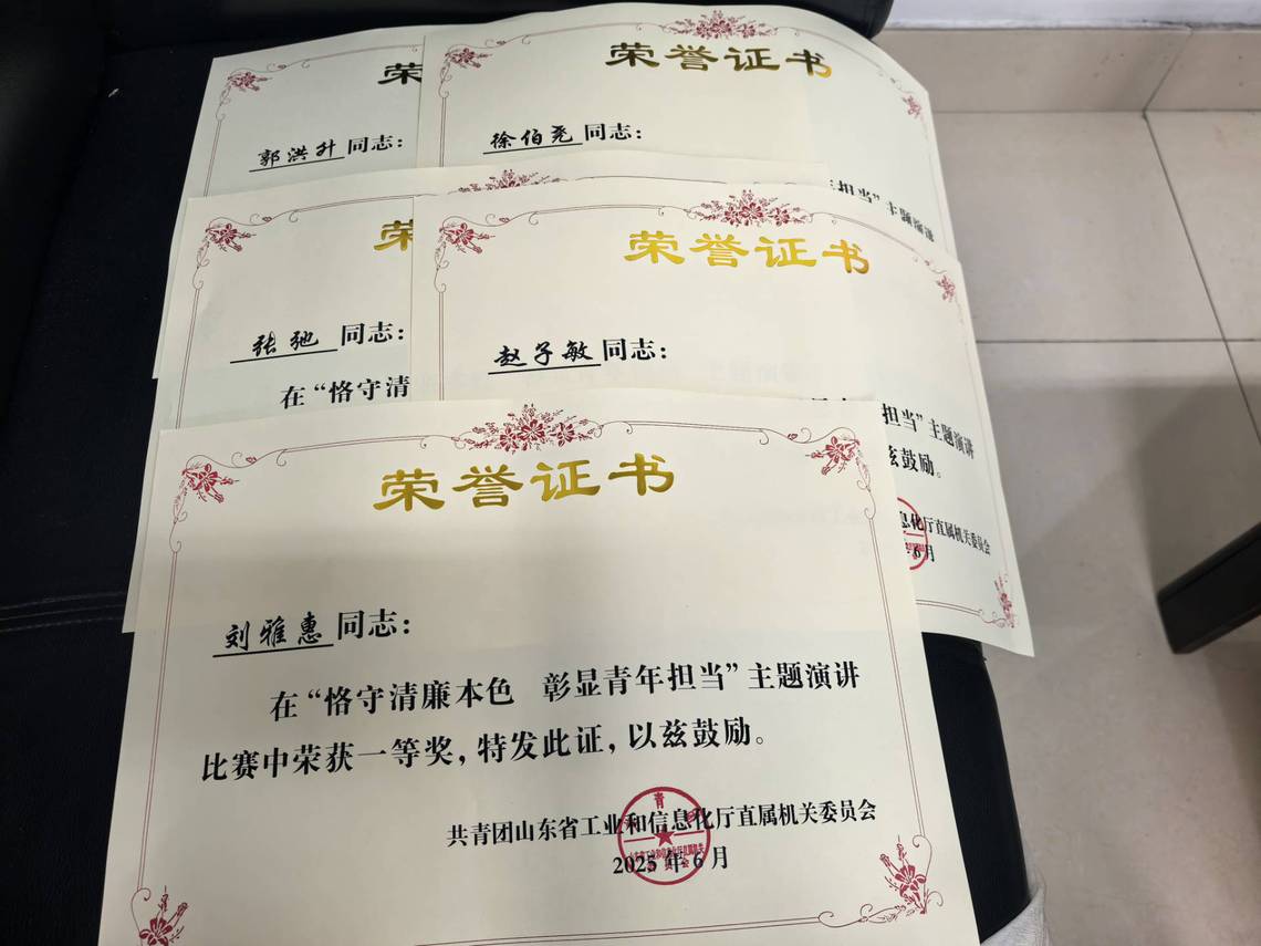 为庆祝中国共产党成立104周年,深入贯彻落实中央八项规定精神,引导青年干部严守党规党纪,6月26日,省工业和信息化厅组织全省工信系统“恪守清廉本色彰显青年担当”主题演讲比赛。来自厅机关、直属单位和省内各地市工信局青年理论学习小组,共计13名青年干部参赛。我校教师代表刘雅惠、赵子敏参赛,凭借出色表现分获一等奖、三等奖,学校荣获优秀组织奖。