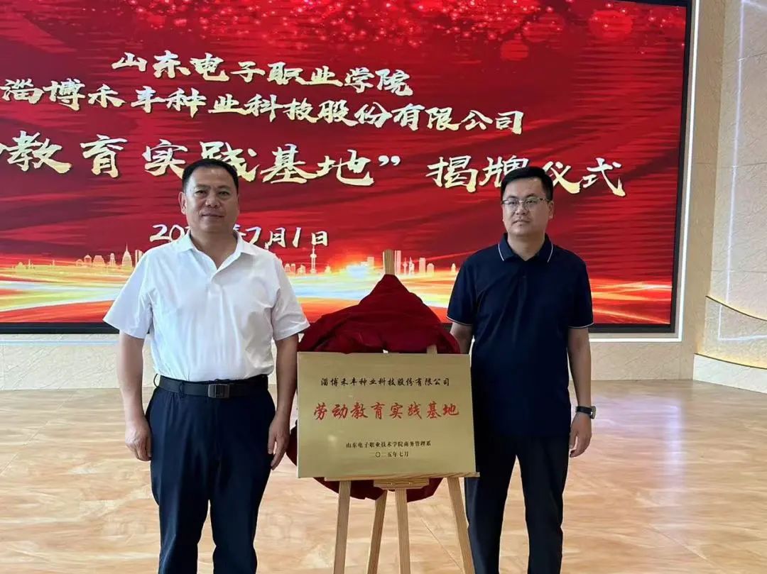 在热烈的氛围中,山东电子职业技术学院院长张建臣与朱台镇党委副书记杨洋共同为“劳动教育实践基地”揭牌。该基地将作为校企协同育人的重要载体,定期组织学生参与农业劳动实践、技术研发和数字化运营,培养学生“知农爱农、强农兴农”的使命感和实践能力。