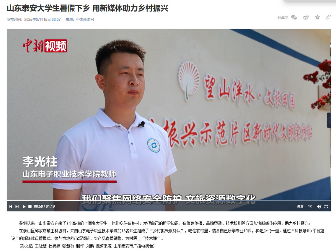 2025年7月,山东电子职业技术学院数字安全学院“e网情深”实践团赴泰安市泰山区邱家店镇王林坡村开展了为期12天的暑期“三下乡”社会实践活动。活动得到泰山区电视台、泰安日报、齐鲁网、中国新闻网等12家媒体关注报道,成为展现当代青年学子担当与风采的生动缩影。