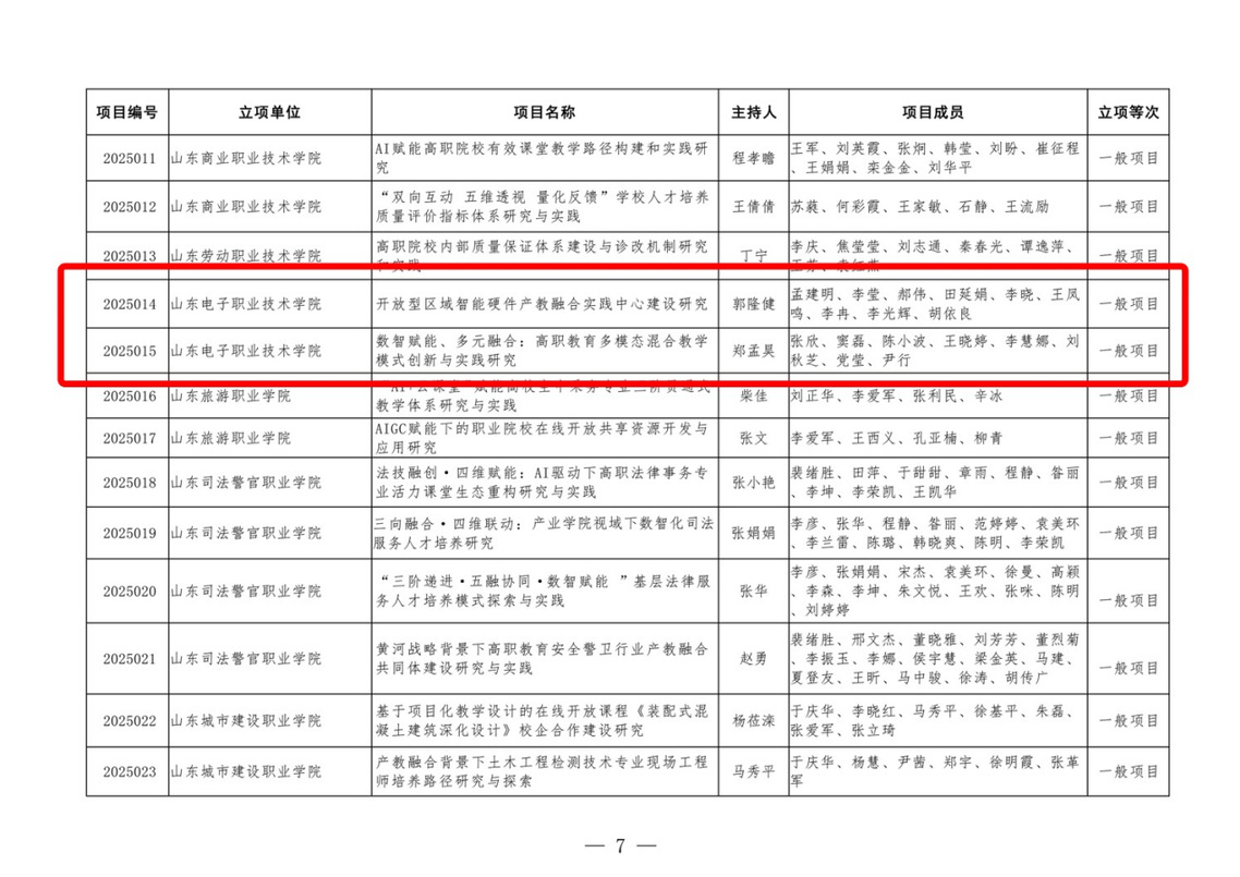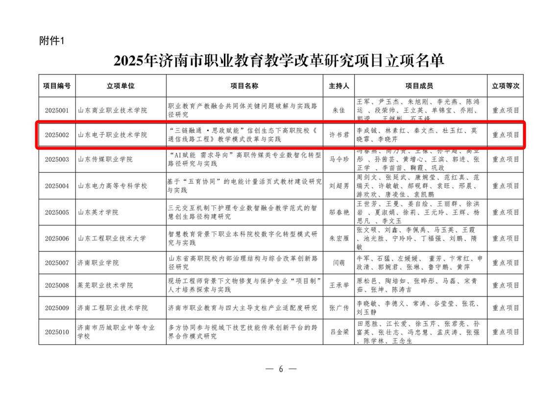 近日,济南市教育局公布了2025年济南市职业教育教学改革研究项目的立项名单,全市共立项重点项目10项,一般项目50项。我校获批重点项目1项,一般项目2项,并获专项经费支持。