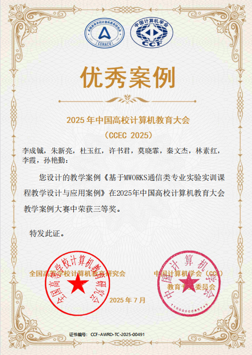 2025年7月11日,中国高校计算机教育大会(CCEC2025)第二届全国计算机教学案例大赛在宁夏银川落下帷幕,我校网络工程系牵头设计的《基于MWORKS通信类专业实验实训课程教学设计与应用案例》在科学计算与系统建模仿真赛道脱颖而出,获得三等奖。