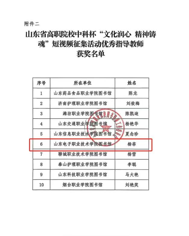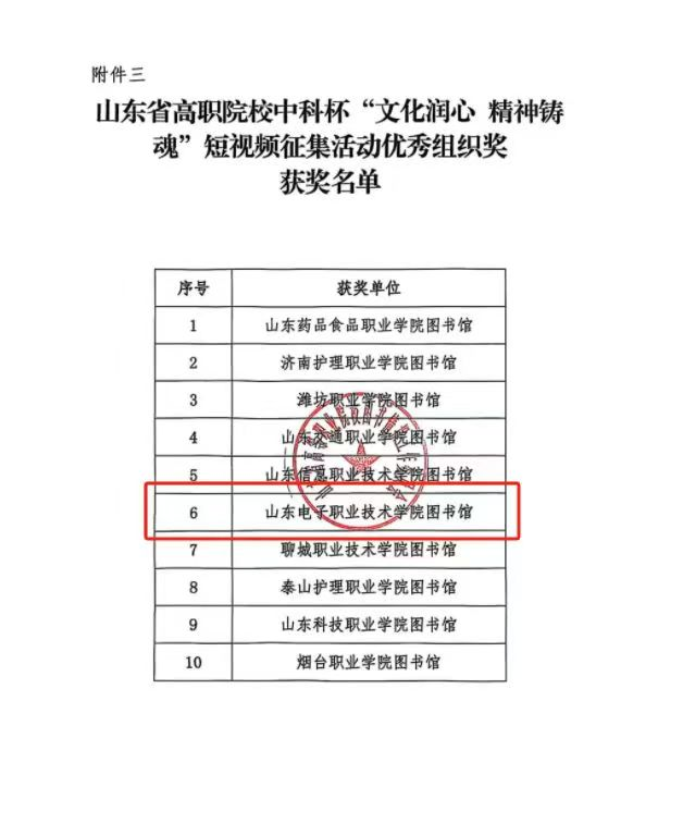 近日,由山东省高等职业院校图书情报工作委员会主办的2025年中科杯“文化润心 精神铸魂”短视频征集活动圆满结束。我校在本次活动中表现突出,获得多项荣誉。