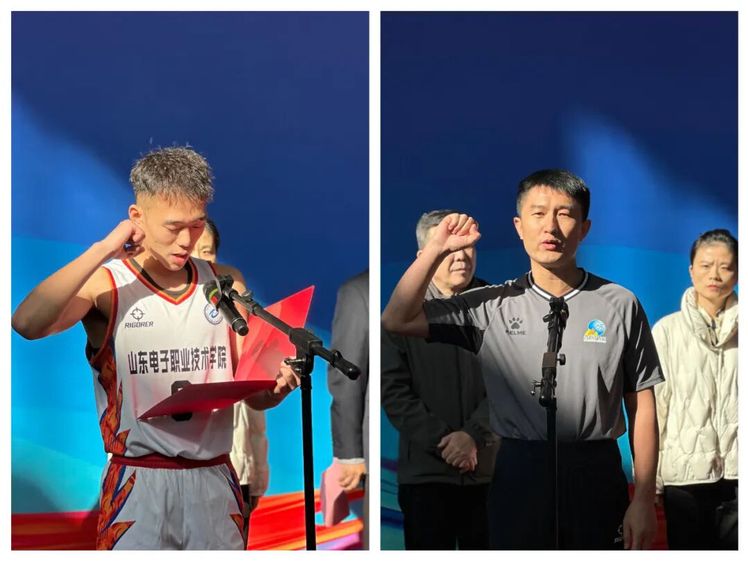 10月21日上午,2025驻章高校大学生篮球联赛在我校体育馆正式开幕。本次大赛由章丘区人民政府主办,章丘大学园区管理服务中心、章丘区教育和体育局、共青团济南市章丘区委、章丘区融媒体中心承办,济南市起航体育文化发展有限公司、齐鲁师范学院、山东电子职业技术学院协办。济南市教育局总督学马炳光、山东广播电视台体育节目中心副总监杨镇、章丘区副区长朱陆益、山东电子职业技术学院副院长王毅东出席开幕式。