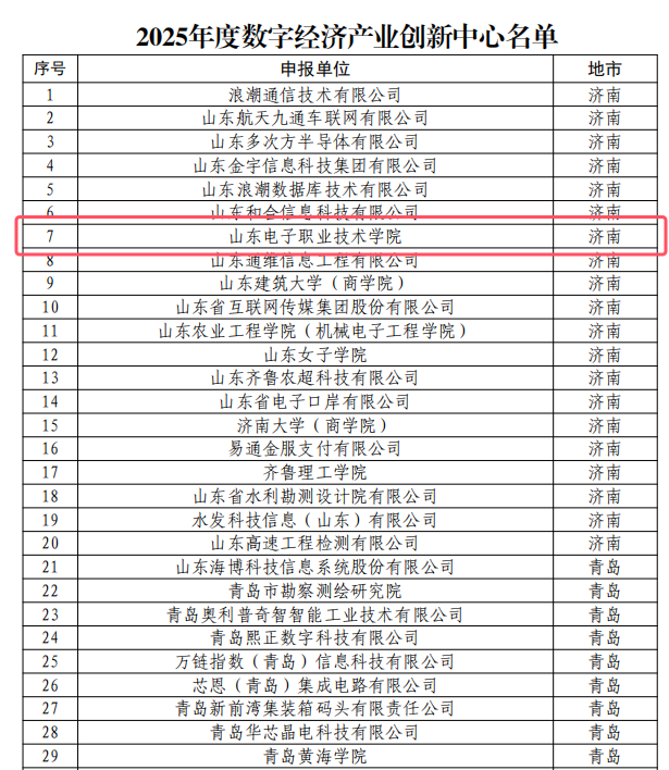 近日,山东省工业和信息化厅公布2025年度山东省数字经济创新平台名单,由我校牵头申报的“数字经济产业创新中心”成功入选,体现了我校在服务数字经济发展、推动产业创新方面取得重要进展。