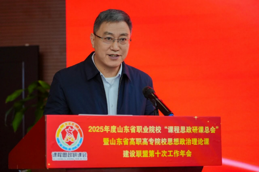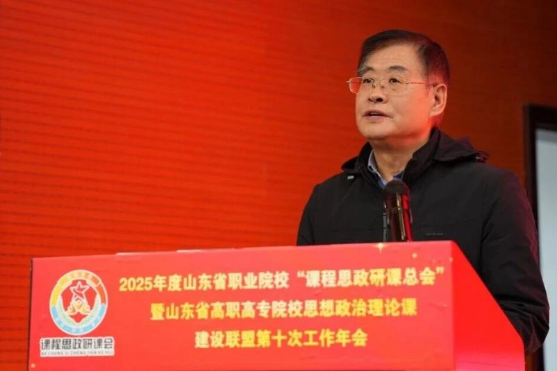 邢桂强在讲话中,祝贺会议召开,强调协会通过搭建教研平台,汇聚育人合力,为山东职业教育高质量发展注入动能,并呼吁思政教育者面向“十五五”注重价值塑造、系统推进、数字赋能与文化浸润,永葆“国之大者”胸怀,锻造“大先生”风范,弘扬“工匠精神”气质,书写职教高质量发展新篇章。