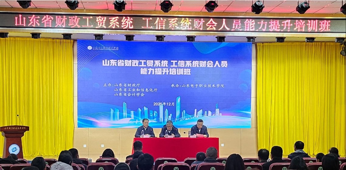 为贯彻落实党中央关于加快发展新质生产力、扎实推进新型工业化的决策部署,近日,山东省财政工贸系统与工信系统财会人员能力提升培训班在我校举行。省工信厅财务处处长、二级巡视员孙洪忠,省财政厅工商贸易处处长李栋林,山东电子职业技术学院院长张建臣出席开班式。来自省财政厅、省工信厅及所属单位、各市财政局和工信局的120余名业务骨干参加培训。