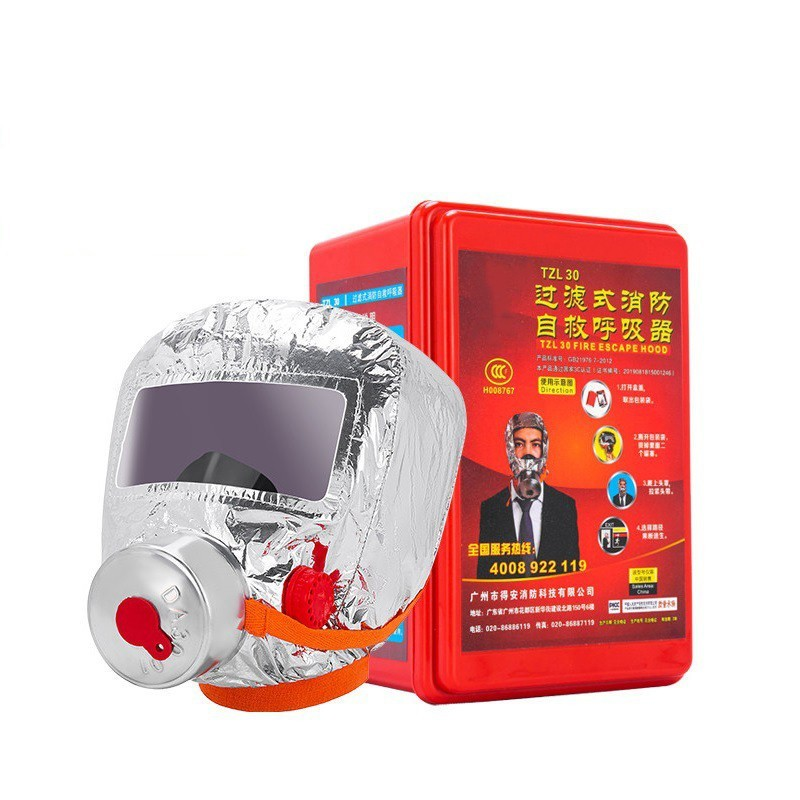 使用方法:当发生火灾时,立即沿包装盘开启标志方向打开盒盖,撕开包装袋取出呼吸装置。沿着提醒带绳拔掉前后两个红色的密封塞,将呼吸器套入头部,向下拉至颈部,滤毒罐应置于鼻子的前面。