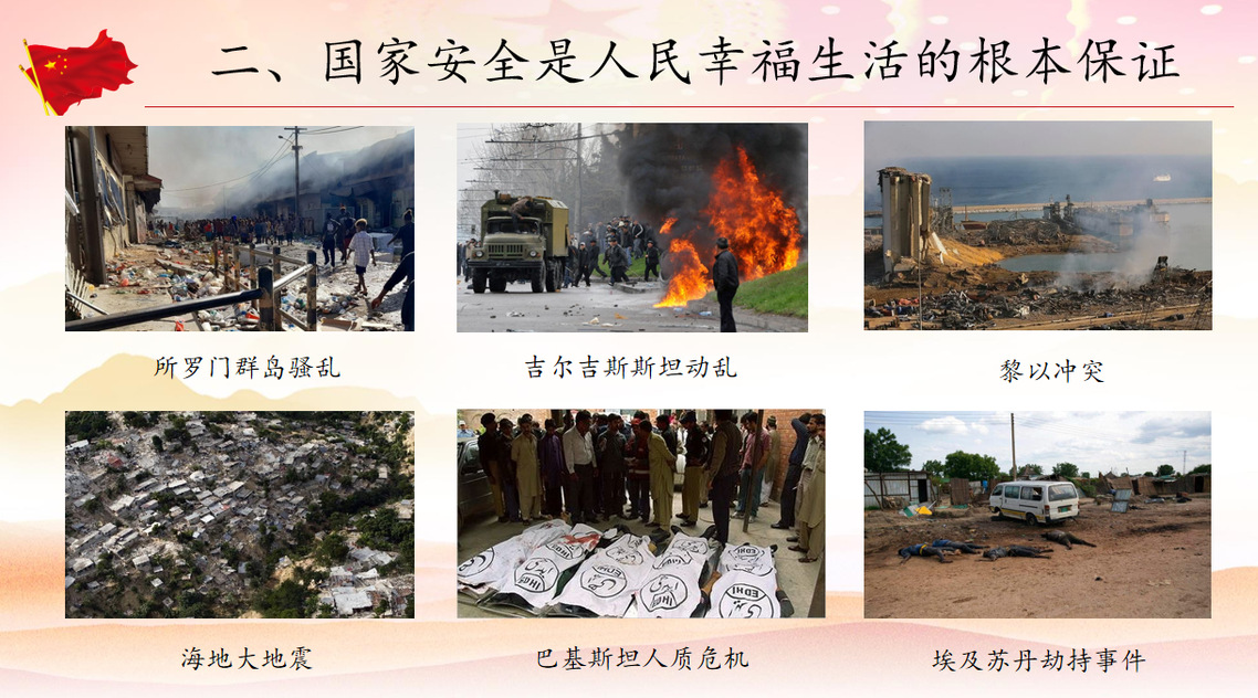 没有国家安全这个前提,国家发展只能是空谈,国家安全遭受破坏,国家发展大计便无从谈起!