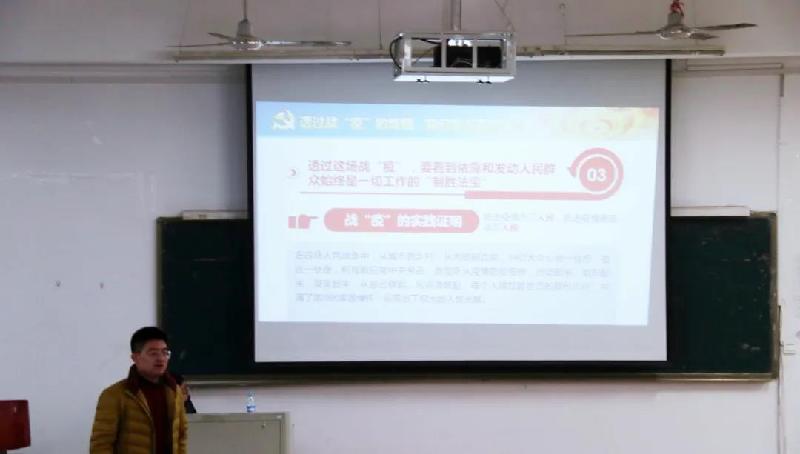 这场突发的疫情对于我们国家来讲,是大疫、大战,也是大考;是对党的执政能力、国家治理体系和治理能力的直接检验和全面考验,也是对我们个人的品德修养、初心使命、能力素质之考。蔡老师围绕“透过战疫的思考”为中心,结合自己的所见、所闻、所思、所想,对接一个个鲜活的事例,教育同学们、启迪同学们、激励同学们以战“疫”英雄为榜样、为标准、为方向,不忘初心、牢记使命,在中国共产党的领导下,这场没有硝烟的战斗见证了无数共产党员无私奉献、顾大家舍小家的家国情怀,看到了广大人民群众为了抗击疫情表现出的团结和奉献。为此,我们更要坚定理想信念,传承红色基因红色文化,弘扬伟大抗疫精神。