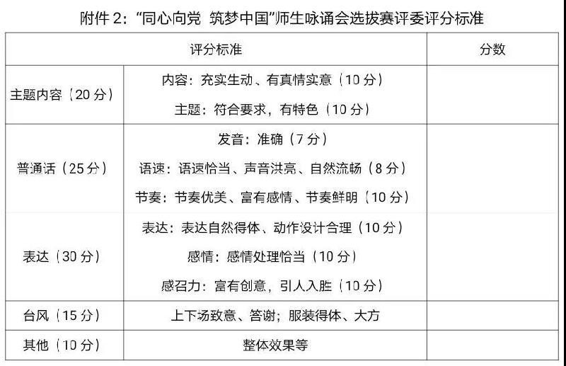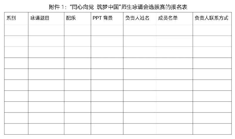 4.填写“同心向党 筑梦中国”师生咏诵会选拔赛报名表,配乐和PPT背景以系别+咏诵题目命名,于6月1日前报送给财经金融系纪肖肖老师。