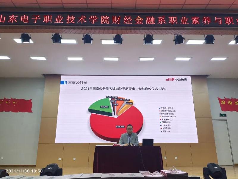 财经金融系为进一步帮助学生明确就业方向,拓展就业空间,引导学生树立正确的职业观和就业观,掌握职业规划的技巧和方法,提高就业能力和职业生涯管理能力,2021年12月1日晚6点30分财经金融系邀请中公教育绍恩君院长召开2020级职业素养与职业规划公益讲座。