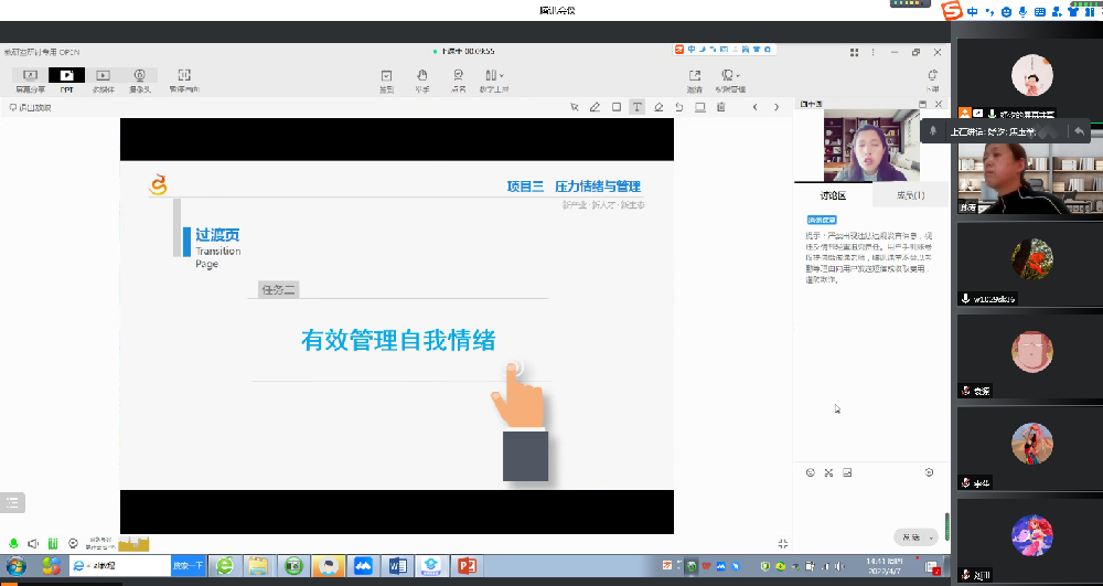 两位教研室主任经验分享后,大家针对线上教学过程中存在的问题进行了讨论,就教学过程中视频使用、截图功能、线上教学时电脑摄像头倾斜角度以及如何与学生互动调动学生学习积极性等细节性问题进行了充分交流。大家纷纷表示通过经验学习与热烈讨论,收获了不少线上教学的经验与心得。