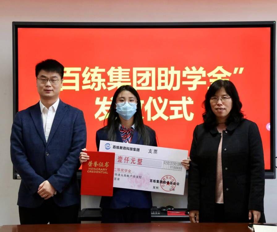 2022年11月1日,山东电子职业技术学院财经金融系于综合楼401举行了“百练集团助学金”发放仪式。财经金融系主任董红和系部相关负责人、百练教育科技集团校企事业部总经理刘凯一行四人参加了本次活动。本次助学金是由企业方全额出资以表彰成绩优异、综合素质优秀的突出个人,促进校企订单班学风建设。