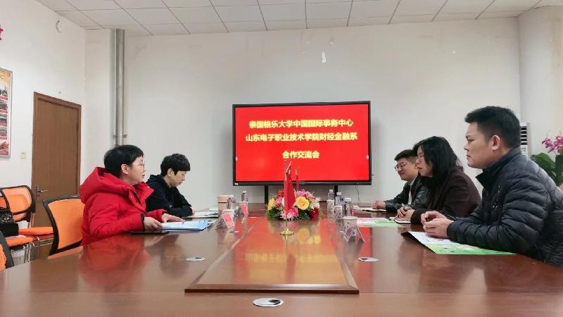 2月22日,泰国格乐大学中国国际事务中心主任李永新及其助理张爱君老师一行到访山东电子职业技术学院财经金融系进行考察交流,双方就未来开展中泰师生文化交流、专本教育合作、阶段联合培养等方面进行磋商,初步达成共识。