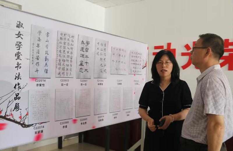 张训华饶有兴趣地查看了学员们的手工书法摄影作品,观看了学员们的精彩表演,对淑女学堂的素质教育工作进行了充分肯定,鼓励同学们继续加强自身修养,努力成为自尊、自信、自立、自强的新时代优秀女大学生。