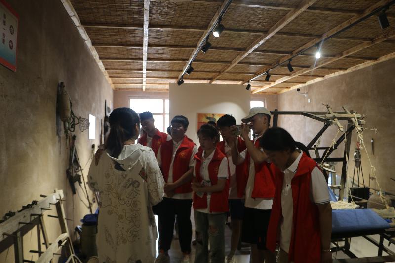 随后,实践团在中联村党委委员、村委会委员张桂芳、村委会委员张巧苓的带领下,来到中联村民俗馆参观,中联村村务监督委员会委员李茂慧作为讲解员为实践团进行讲解。实践团首先参观了男耕女织展厅,李茂慧结合展厅内的藏品,分别从耕地、播种、收获、织布、缝纫等方面展开讲解,同学们从中切身感受到黄河流域农耕用具的发展变迁,以及黄河流域农耕文化的博大精深。在婚庆嫁娶展厅,李茂慧则按照历史脉络,将订婚、结婚时的风俗习惯、孩子诞生后的吃穿住行与藏品之间的联系一一展开做了细致的讲解。
