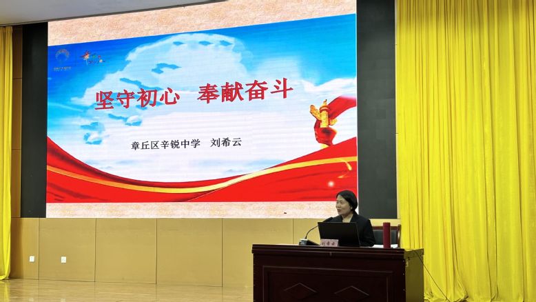 刘希云老师以“坚守初心、奉献奋斗”为主题重点讲述了巾帼英雄辛锐的故事。辛锐,山东省章丘区辛寨镇辛寨二村人,抗日英雄,著名革命烈士陈明的妻子,姊妹剧团团长,牺牲时年仅23岁。刘老师从辛锐家庭背景介绍起,辛锐的祖父、父亲都是当时进步人士,1938年辛锐和家人一起来到沂蒙山区抗日根据地参加了八路军,从事革命文艺宣传工作。1941年在日军扫荡搜山过程与日军同归于尽。刘希云老师在讲解中几次哽咽,在座党员教师也倍受感染,被辛锐的英雄事迹所感动,潸然泪下。