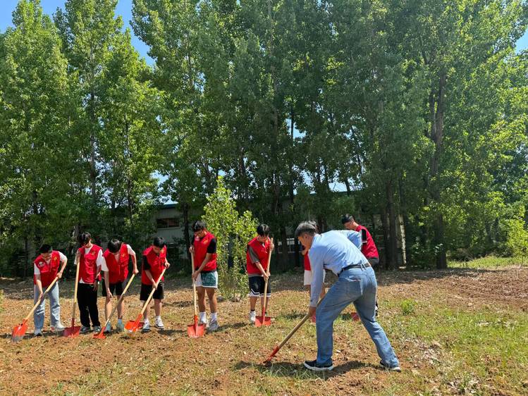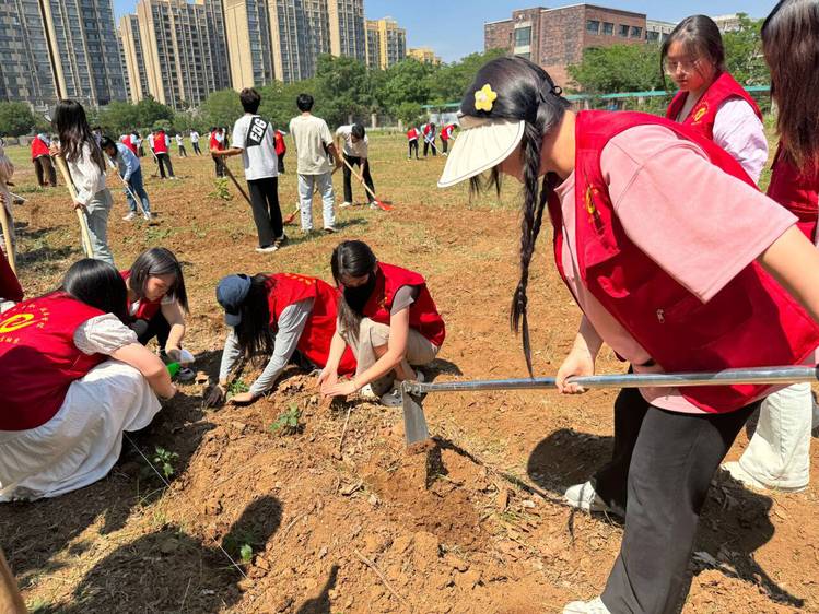 活动有条不紊地开展,同学们都积极踊跃地参加。在颜晓辰老师的亲自示范与指导下,男同学们热火朝天地挥舞着铁锹开垦荒地。他们不怕脏,不怕累,互相鼓励、干劲十足。女同学们则由周倩老师带领,井然有序排队领取菜苗,栽种、浇水。尽管汗水浸湿了衣衫,但同学们的脸上洋溢着满足和快乐的笑容,整个基地充满了欢声笑语,洋溢着青春的活力与热情。在师生们的共同努力下,80余株辣椒苗在这片充满希望的田野上扎根生长。这不仅是劳动成果的象征,更是同学们辛勤付出的见证。完成栽种后,大家纷纷与自己的劳动成果合影留念,用照片记录下这一难忘时刻。