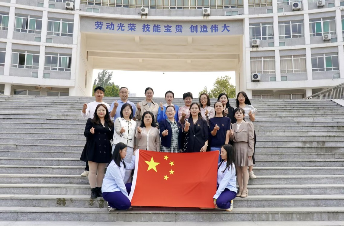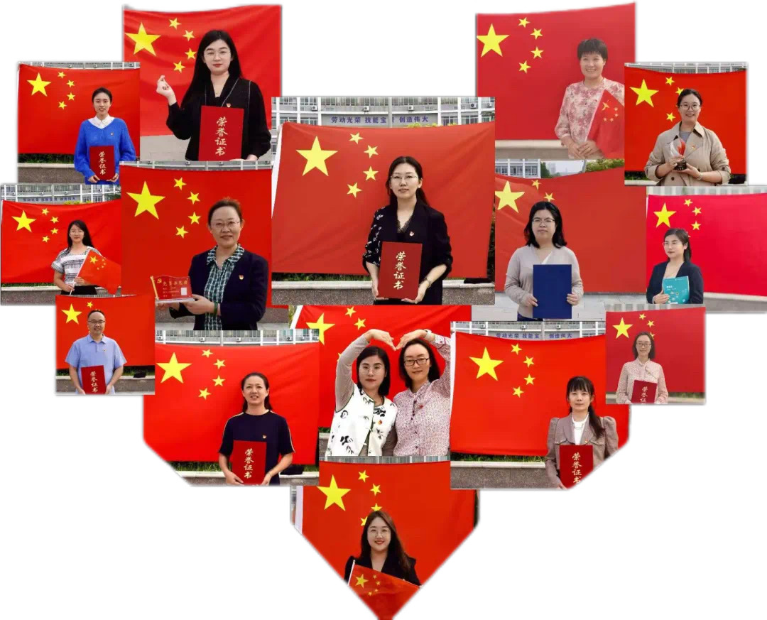 党员教师齐聚综合楼前,手中挥舞国旗,纷纷向祖国送上美好祝福。随后,党员教师们逐一与国旗合影留念,有的手拿党员示范岗牌向祖国郑重承诺,有的手握奖杯向祖国汇报成果、有的以荣誉证书向祖国献礼,有的比着爱心向祖国表达浓浓爱意。