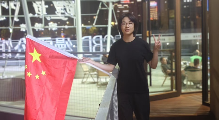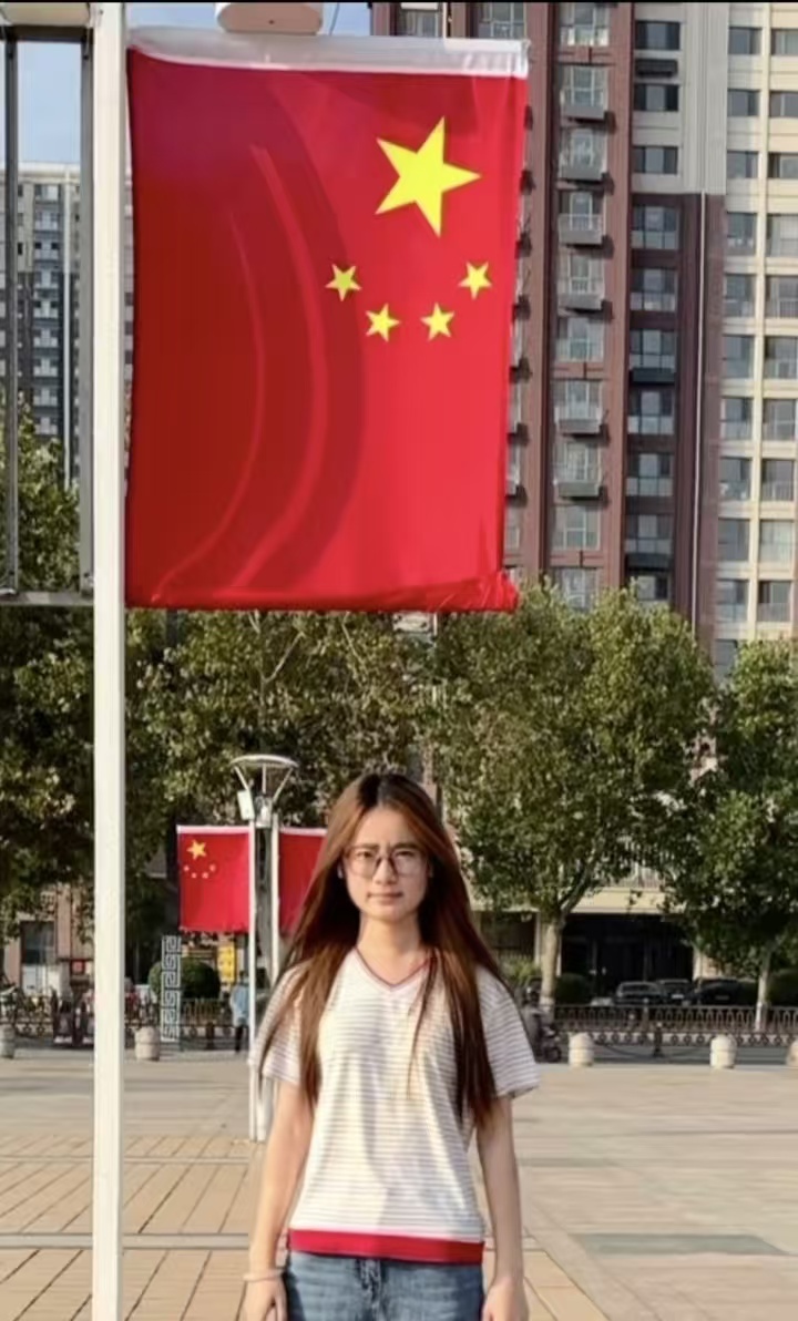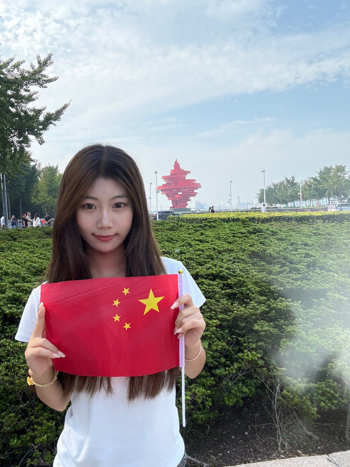 我是财经金融系C25001班的张洁,我在临沂市人民广场与国旗合影,站在国旗下看红旗漫卷长空,忽然明白了强国有我不是口号,课堂上学习的专业知识以及实验室里熬过的夜都在与国家的发展同频。这个国庆,我将祝福写进错题本,愿与青春微光一起,汇入时代星河。