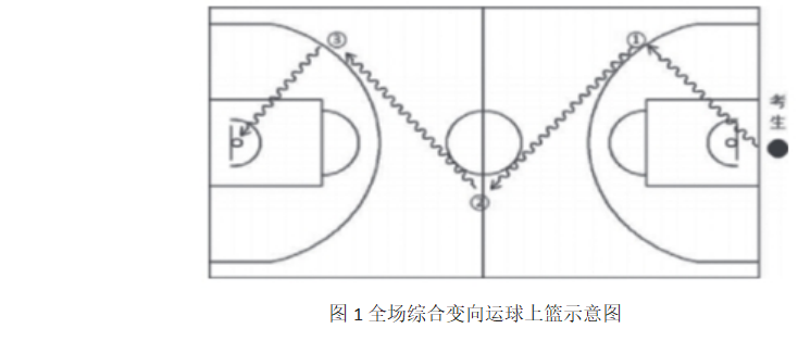 测试方法:如图1所示。考生在球场端线中点外出发,持球站立,当其身体任意部位穿过端线外沿的垂直面时开始计时。考生用右手运球至①处,在①处做右手背后运球,换左手向②处运球,至②处做左手后转身运球,换右手运球至③处,在③处做右手胯下运球后右手上篮。球中篮后,方可用左手运球返回③处,在③处做左手背后运球,换右手向②处运球,在②处做右手后转身运球,换左手向①处运球,在①处做左手胯下运球后左手上篮。球中后做同样的动作再重复一次,最后一次上篮命中后,持球冲出端线,考生身体任意部位穿过端线外沿垂直面时停止计时,记录完成的时间。每人测试2次,取最好成绩。