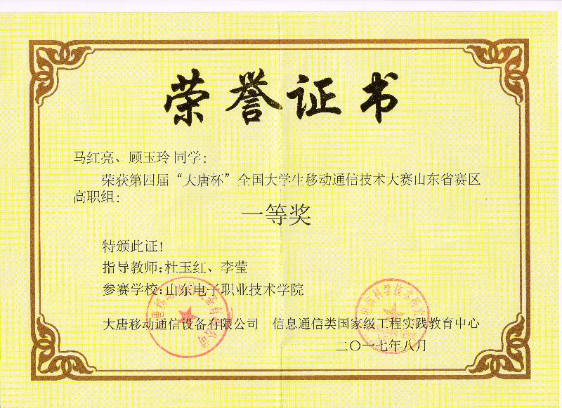 第四届“大唐杯”全国高职院校大学生移动通信技术大赛全国总决赛一等奖