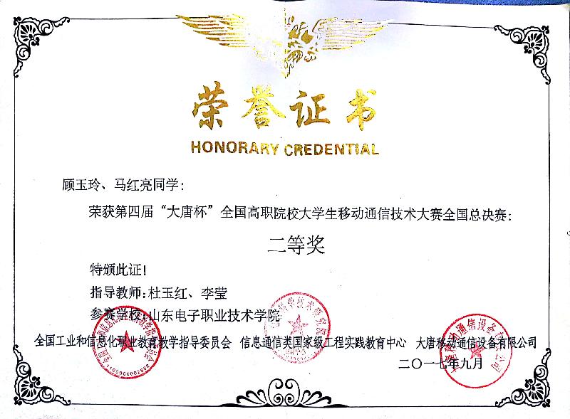 第四届“大唐杯”全国高职院校大学生移动通信技术大赛全国总决赛二等奖