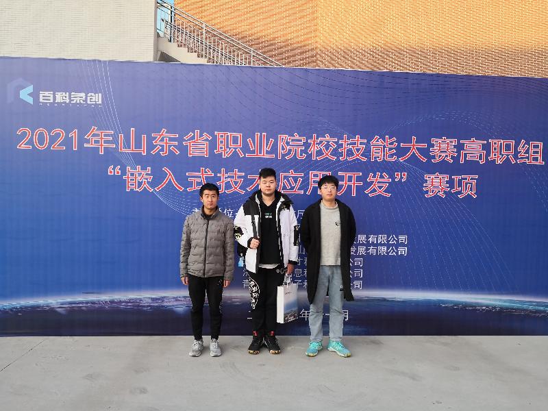 11月25至27日,2021年山东省职业院校技能大赛高职组“嵌入式技术应用开发”赛项在莱芜职业技术学院举办,来自山东省28所高职院校参赛队参赛。由孟建明、郝伟指导,李炫霆、张晓永、魏政三位同学组成的代表队,经过十个小时的紧张比赛,以第二名的成绩荣获一等奖。