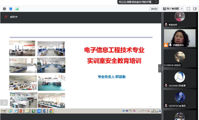 2022年10月8日晚8点,通过腾讯会议的线上学习平台,由专业带头人郭建勤面向2022级电子信息工程技术专业新同学,主持开展了实训室安全教育培训活动。