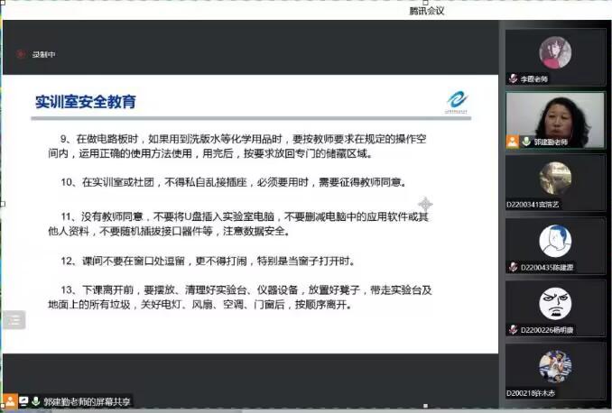 2022年10月8日晚8点,通过腾讯会议的线上学习平台,由专业带头人郭建勤面向2022级电子信息工程技术专业新同学,主持开展了实训室安全教育培训活动。
