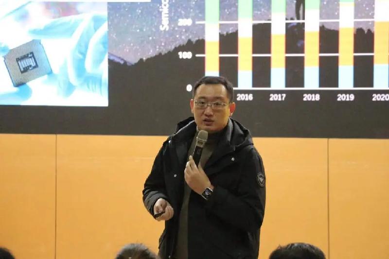 张佳一以视频为引入给同学讲解芯片在中国的发展现状,随后介绍了半导体在全球智能化发展中的重要地位,提出我国在芯片技术层面仍有很大的发展空间急需更多技术人才。