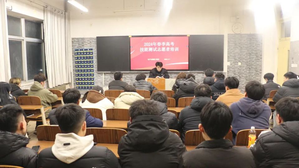 为做好2024年春季高考技能考试志愿服务工作,3月7日晚,电子与通信工程系对参加本次考试志愿服务工作的34位志愿者进行培训。齐贺宁,刘锦江主持会议。