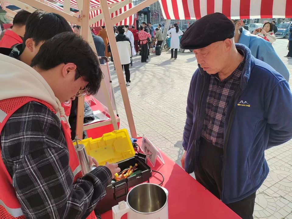 “这小伙子一会儿就解决了我的难题,非常的专业,必须夸夸他们的好技术”。在高官寨黄河大集活动现场,吸引了众多朋友前来“赶集”。其中,“爱心集市”—家电维修成为大家的最爱。闻讯而来的居民们陆陆续续把家中不能正常工作的手机、电水壶、电磁炉等小家电拿来让志愿者们“会诊”。青年志愿者们耐心向大家科普家电使用方法及保养常识,提供维修建议,获得居民朋友的一致好评。