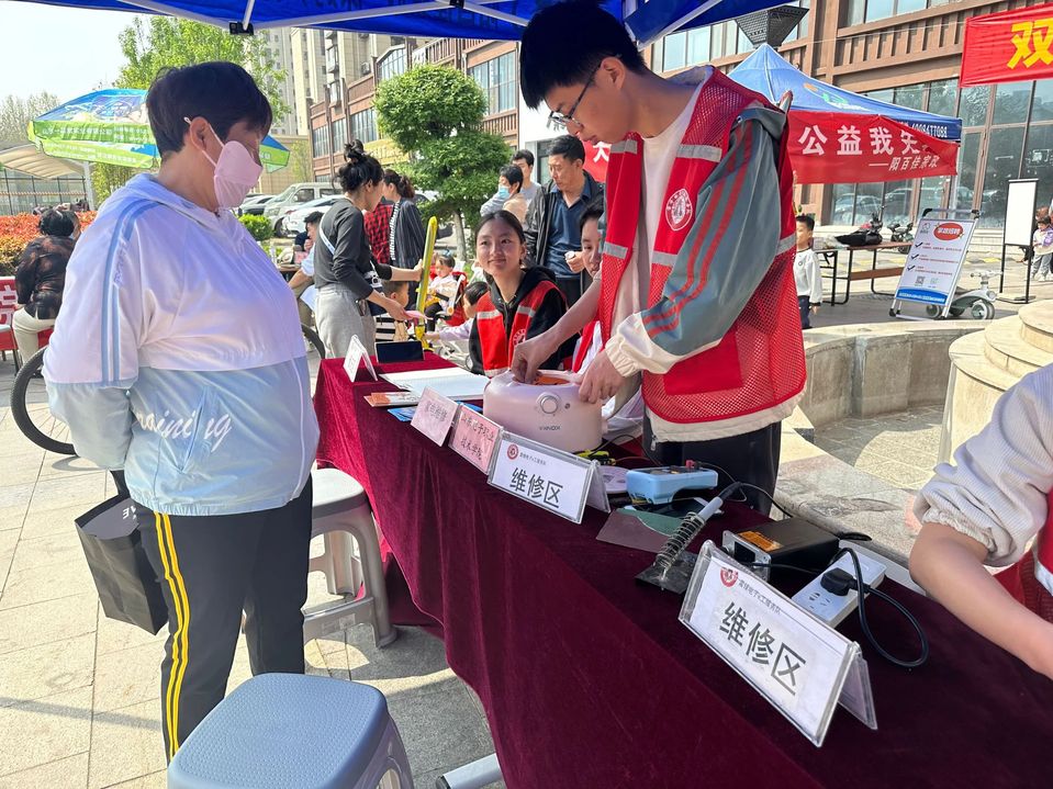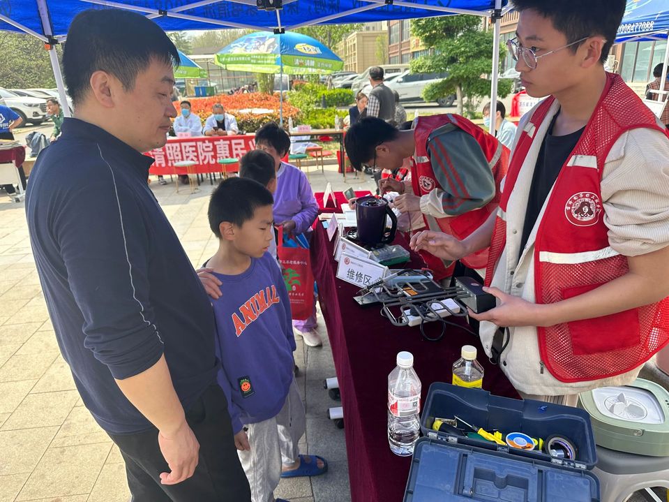 场地还未布置完毕就有许多居民围了过来,“小同志,我这电水壶水都烧开了灯一直亮着”“同学帮阿姨看看这个豆浆机怎么不工作了”“大哥哥,能不能帮我们修修这个故事机,他说话断断续续的”面对各种疑难杂症志愿者们有条不紊,仔细询问电器出现的故障,将所学知识化为专业能力认真修理,眨眼之间电器们就恢复生机。