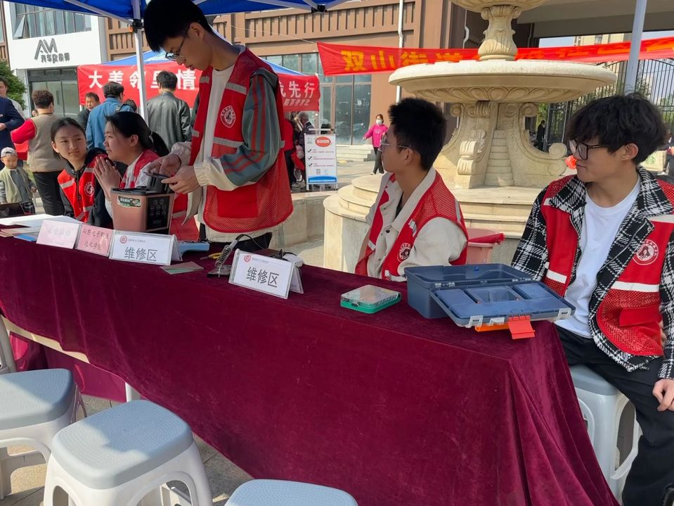 4月13日上午,双山街道玺城社区里出现了一抹别样的鲜红,那是雷锋电子e工服务队志愿服务的身影。