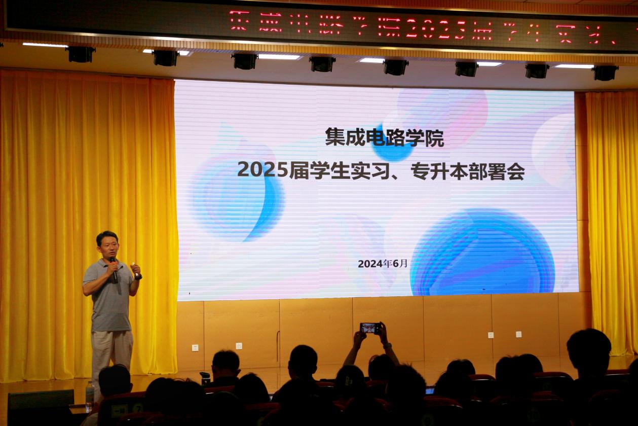 为了扎实做好2025届毕业生实习工作,进一步促进学生对所学知识和技能进行实践运用、总结和深化,引导学生明确认识实习的目的和意义。6月13日,集成电路学院2025届毕业生实习动员大会在学术报告厅召开。集成电路学院院长郭隆健、副院长孟建明、团总支书记王宁、综合科科长郝伟、全体辅导员、实习指导教师及2025届毕业生参加了此次会议。会议由孟建明主持。