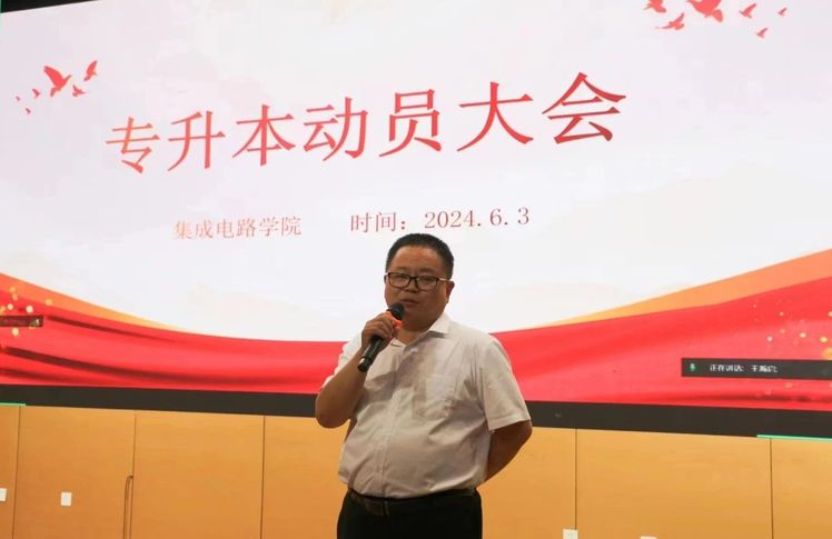为做好专升本工作,提高专升本录取比例,增加就业和发展的机会,促进同学们高质量就业,集成电路学院特此举办专升本动员大会。出席本次会议的有党总支书记郭隆健、团总支书记王宁、辅导员段元兴及全体在校生。
