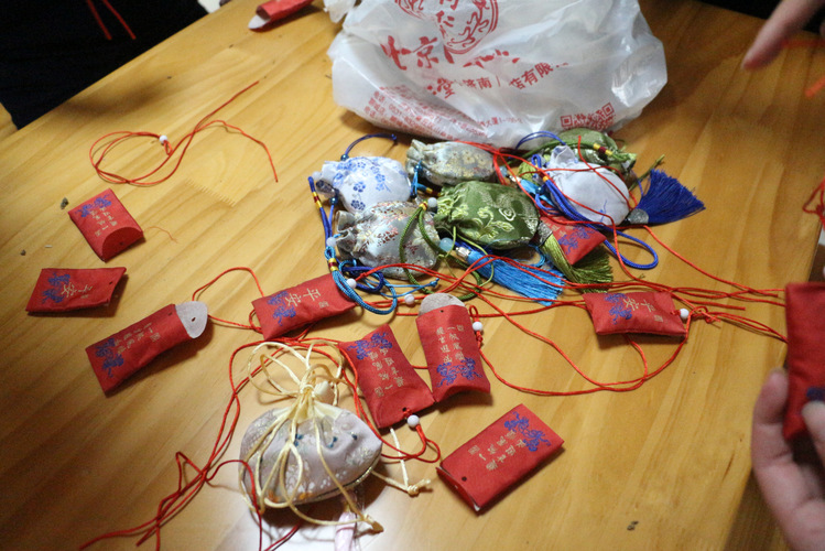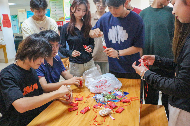 “粽”意浓浓之时,老师同学们开始探索制作代表端午文化的另一个传统物件——香囊。彩布缝合,细线打结,药包填充后再以抽绳弦扣成索,一个个玲珑夺目、立体饱满的香囊就制作完成。大家不仅体验了传统手工艺的魅力,也在浓浓的艾草香中感受中华传统节日的魅力。