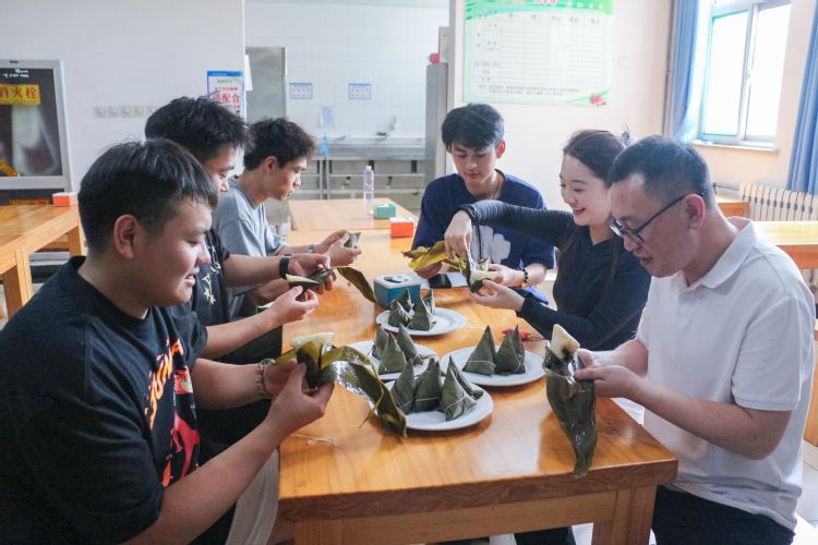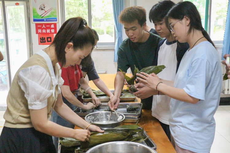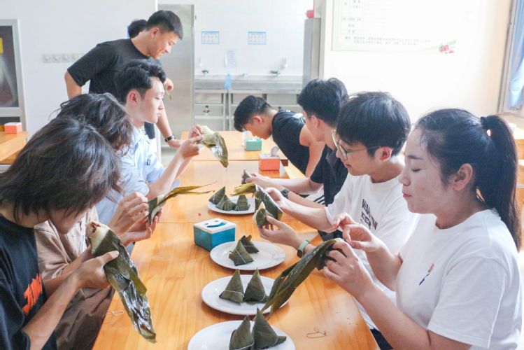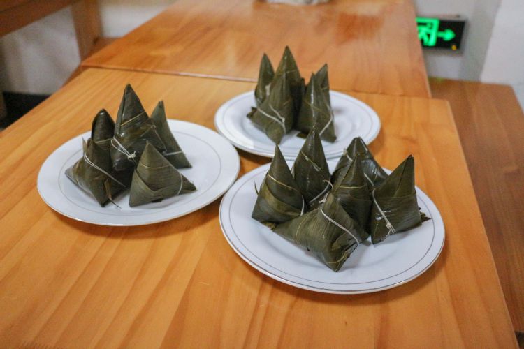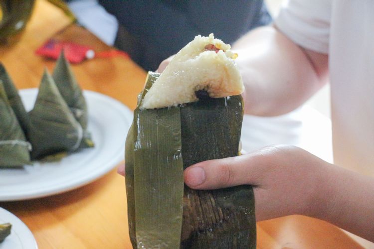 在大家的相互鼓励和帮助下,一个个形态各异、饱满诱人的粽子逐渐成型。经历了一个小时左右的等待后,由老师同学们亲手制作的粽子新鲜出锅,大家围坐在一起,品尝自己亲手包的粽子,现场气氛热烈而融洽。