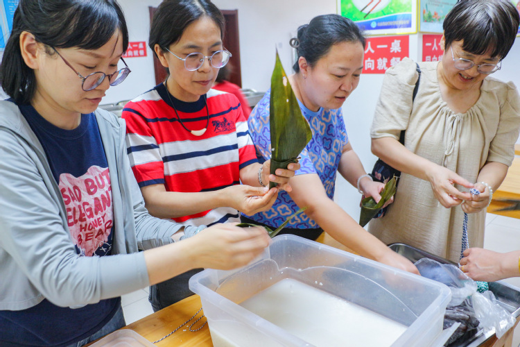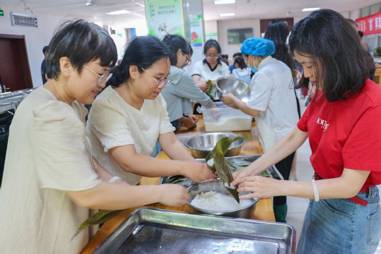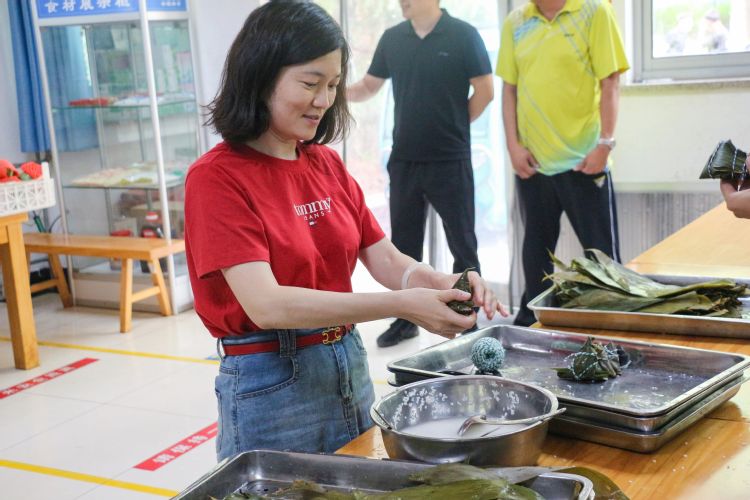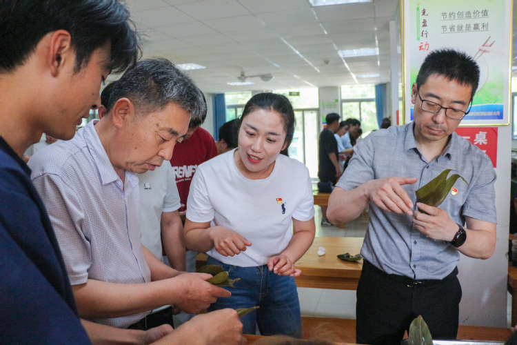 活动伊始,大家观看学习了包粽子的具体步骤演示。工作人员还分享了一些实用的包粽子技巧,从粽叶的折叠、糯米的填充,到粽子的捆绑、打结,均进行了细致的讲解和示范。大家围坐在一起,纷纷拿出“看家本领”,彼此传授着包粽子的方法和技巧。粽叶翻飞、馅料搭配,每个人都神情专注,耐心将粽子包裹成型。领导老师们也加入其中,与大家一起动手包粽子,共同体验劳动的乐趣、分享节日的喜悦。