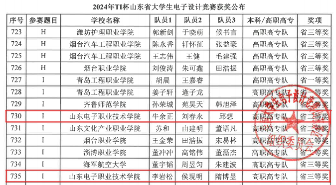 7月29日—8月5日,2024年TI杯全国大学生电子设计竞赛山东赛区竞赛在山东农业工程学院淄博校区举行,我校集成电路学院6支队伍参赛,荣获5项奖项,其中二等奖1项,三等奖4项。