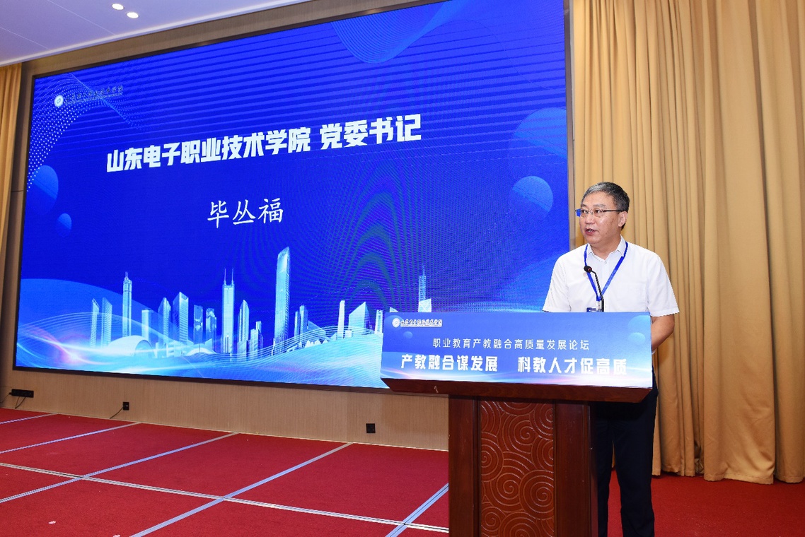 在接下来召开的职业教育产教融合高质量发展论坛开幕式上,山东电子职业技术学院党委书记毕丛福在致辞中表示,山东电子职业技术学院将会持续推进与企业贴紧靠实的“捆绑式”发展,共同构筑人才培养新机制。会上,宣读了《全国数字与智能化行业产教融合共同体主要成员名单》,山东电子职业技术学院被授予“理事长单位”。