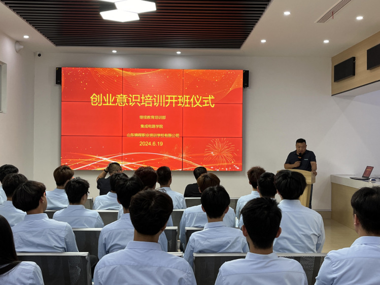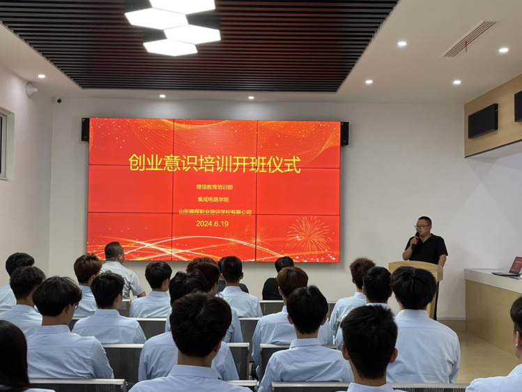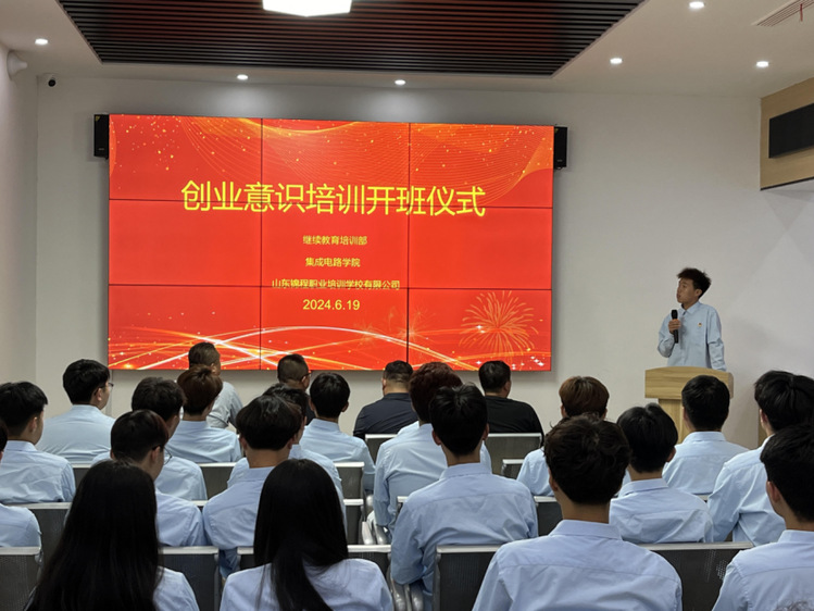 为帮助大学生增强创业意识,理清创业思路,学习创业技能,增强创业能力。近日,在继续教育培训部的大力支持下,集成电路学院与山东锦程职业培训学校有限公司展开合作,并正式召开开班仪式,仪式由集成电路学院团总支书记王宁主持,继续教育培训部主任王延武、集成电路学院党总支书记郭隆健、山东锦程职业培训学校有限公司代表朱广鹏和23级学生代表参加。