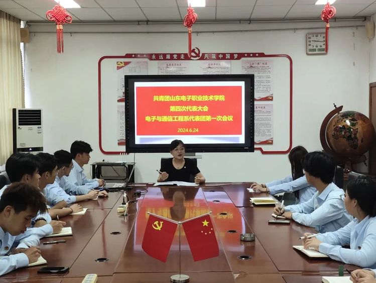 共青团山东电子职业技术学院第四次代表大会电子与通信工程系代表团第一次会议于6月24日在综合楼216召开。本次会议由团总支书记王宁主持,旨在为即将到来的第四次代表大会做好充分的准备和部署工作。