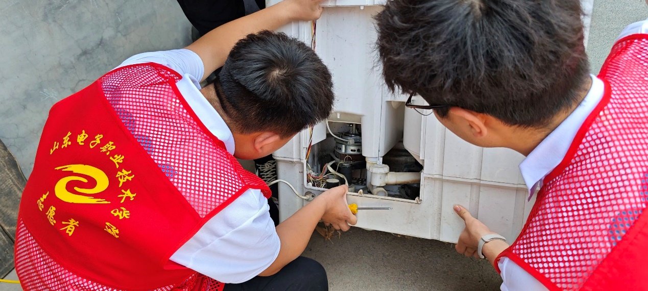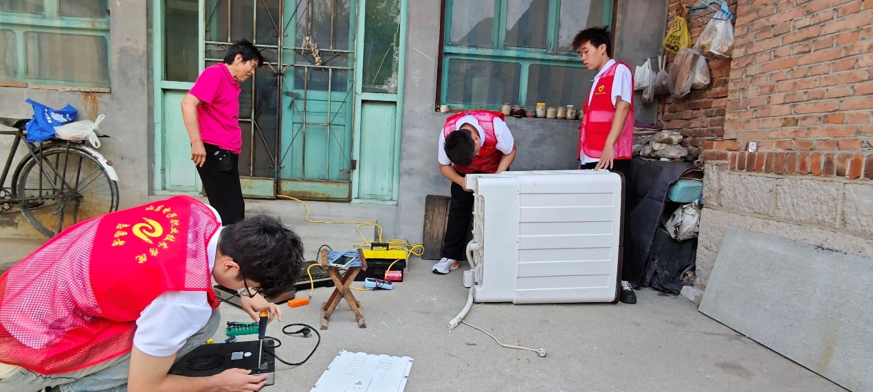 根据前期调研结果,队员们分组走访需要帮助的村民。维修过程中,队员们认真听取居民的需求,仔细检查故障家电,运用所学专业知识精准维修。居民李大妈的洗衣机已放置多年未用,原本以为是机子老化损坏无法使用,队员们仔细检查后发现只是小故障,通过维修成功让洗衣机“起死回生”。李大妈激动地说:“这些孩子们真能干,真是帮了大忙了。”