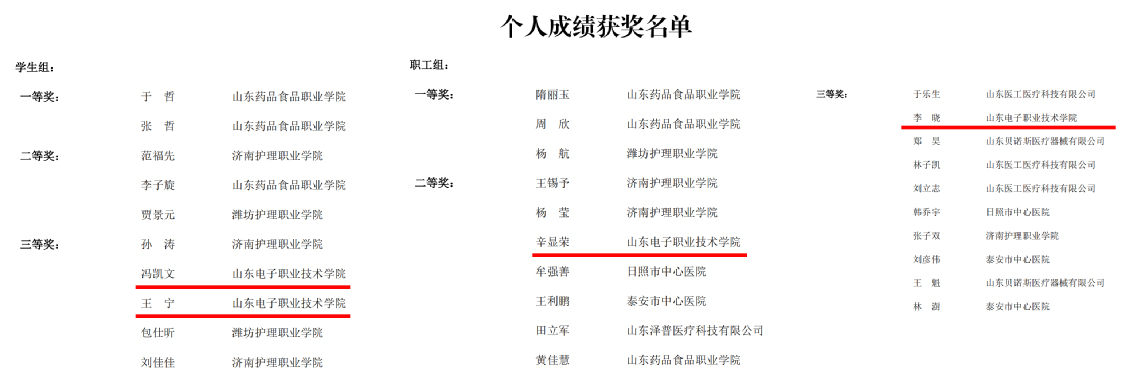近日,2024年山东省“技能兴鲁”职业技能大赛——首届山东省医疗器械行业职业技能竞赛在山东药品食品职业学院圆满落下帷幕。我校集成电路学院智能医疗装备技术专业教师辛显荣、李晓分别荣获二等奖、三等奖,学生冯凯文、王宁荣获三等奖。