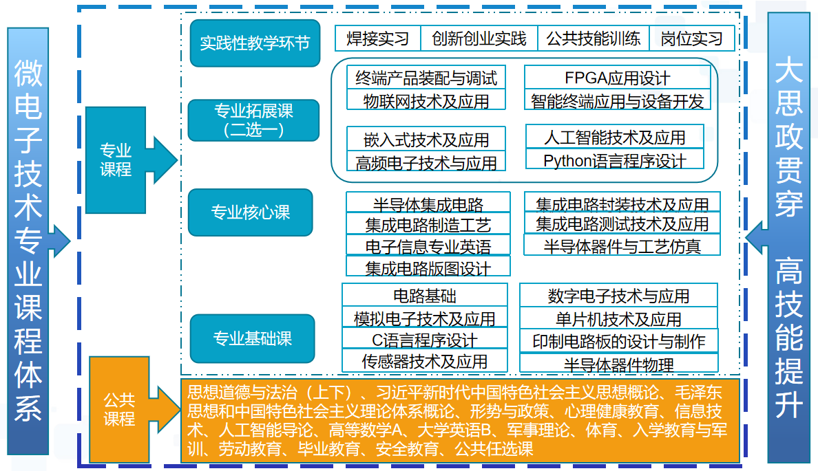 为适应半导体产业高速发展与集成电路技术革新对芯片设计、制造工艺、封装测试及设备运维等领域的迫切需求,面向微电子行业高集成度、高性能、低功耗发展方向,本专业聚焦第三代半导体、先进封装、智能传感器等新兴领域,围绕集成电路晶圆制造、集成电路封装、集成电路测试等岗位群的核心能力要求,以服务集成电路产业国产化与高质量发展为目标,深化专业内涵建设与数字化升级,推进产教融合协同育人模式,着力培养具备扎实理论基础、精湛技术技能和创新实践能力的复合型高技能人才。