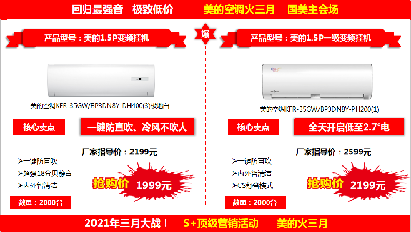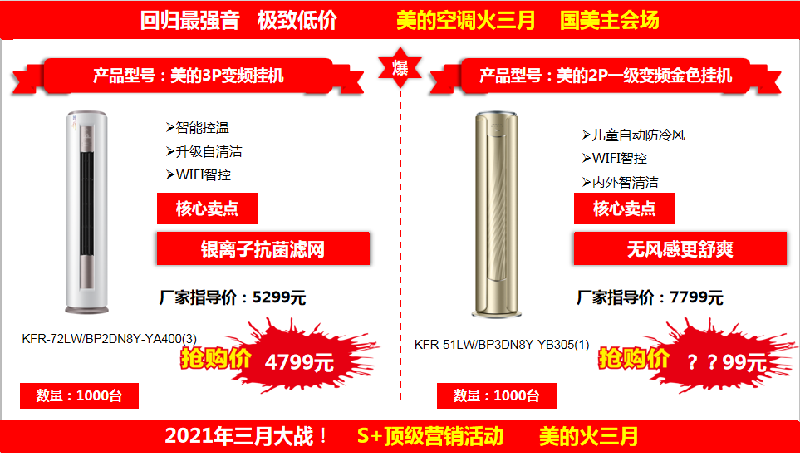特权三:美的空调无风感超级套购,第二件半价,第三件免单。